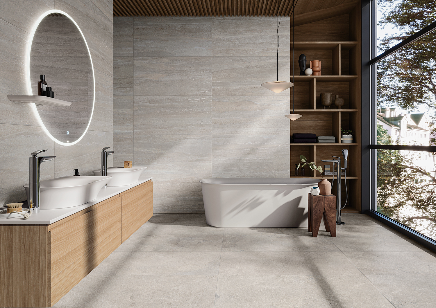 Sophistication doesn’t always come from bold contrasts—it can also be found in gentle layers of a single palette. In this bathroom, Portland Stone tiles flow seamlessly across the floor and walls, while wood accents add warmth without breaking the calm continuity. The result is a serene, spa-like atmosphere where subtle variations in tone and texture create a sense of quiet luxury.