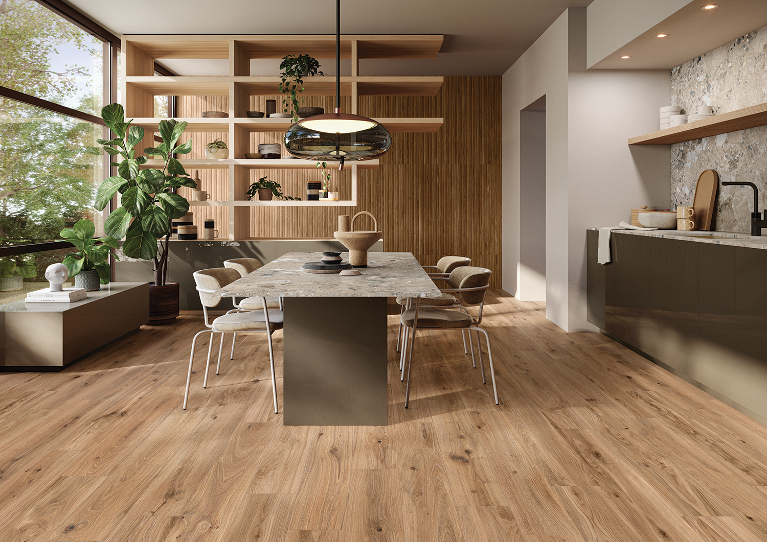 In this space, the Sapien Wood floor tiles set a natural, inviting tone, while the Sapien Wood Decor wall tiles add a sense of rhythm and verticality. The Maximus Flakestone surfaces, used for both the dining tabletop and kitchen countertop, introduce a refined stone effect that balances the warmth of wood with contemporary elegance. Together, these elements show how mixing finishes and formats can create a space that feels layered, modern, and harmonious.