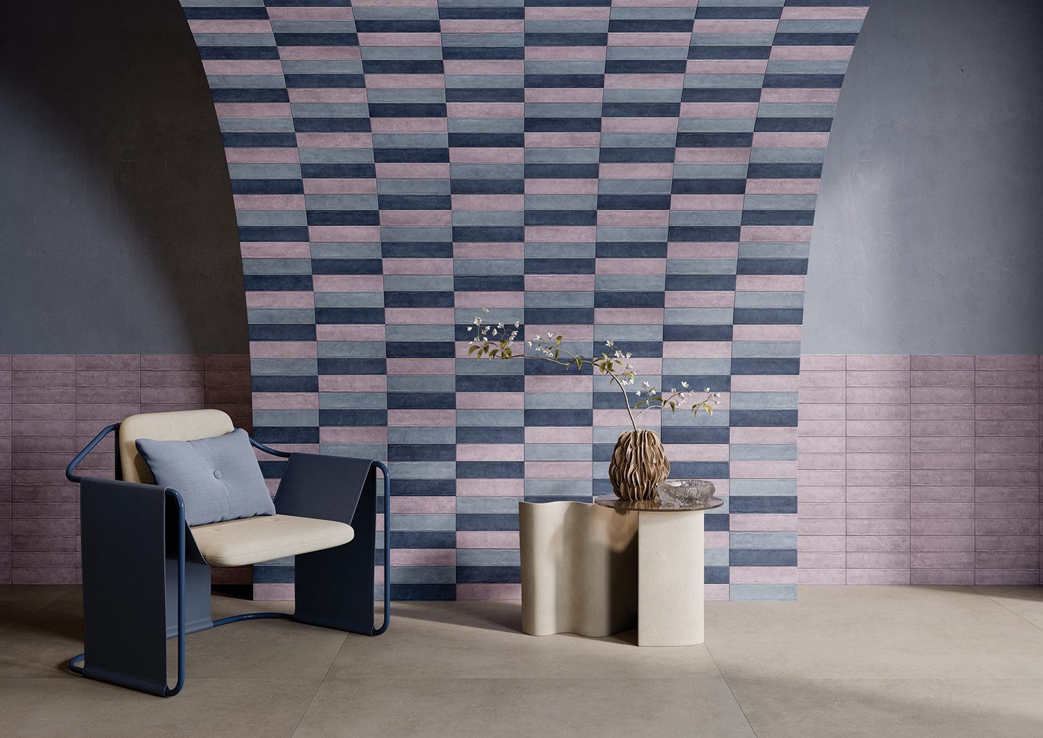 A striking wall pattern can completely transform a space, especially when paired with softer, more muted surfaces. In this setting, Creative Concrete P Brick tiles in alternating shades of blue and mauve form a bold geometric rhythm, while the neutral base of Creative Concrete P floor tiles grounds the design with calm sophistication. The result is a space where contrast feels modern and artistic, yet effortlessly balanced.