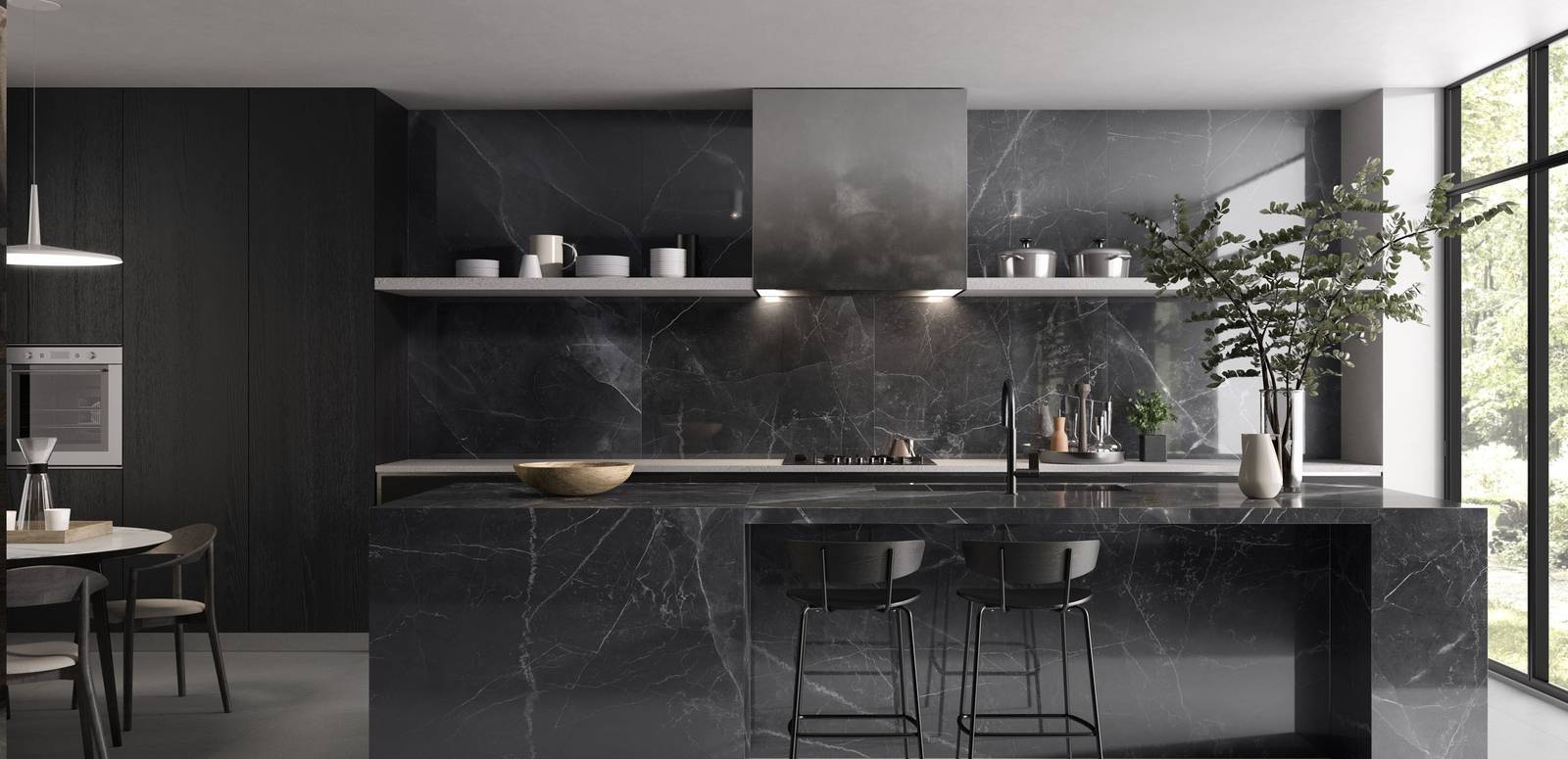 Inspired by amani marble, an elegant and precious stone from spain. Characterised by an intense and deep three-dimensionality, armani marble is a fairly homogeneous dark gray material with thin white veins and is particularly suitable for sophisticated interior furnishings and worktops. Light grey, dark grey and dark brown are the colours chosen for this luxurious collection.