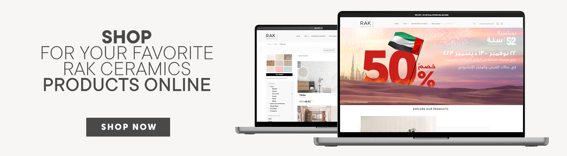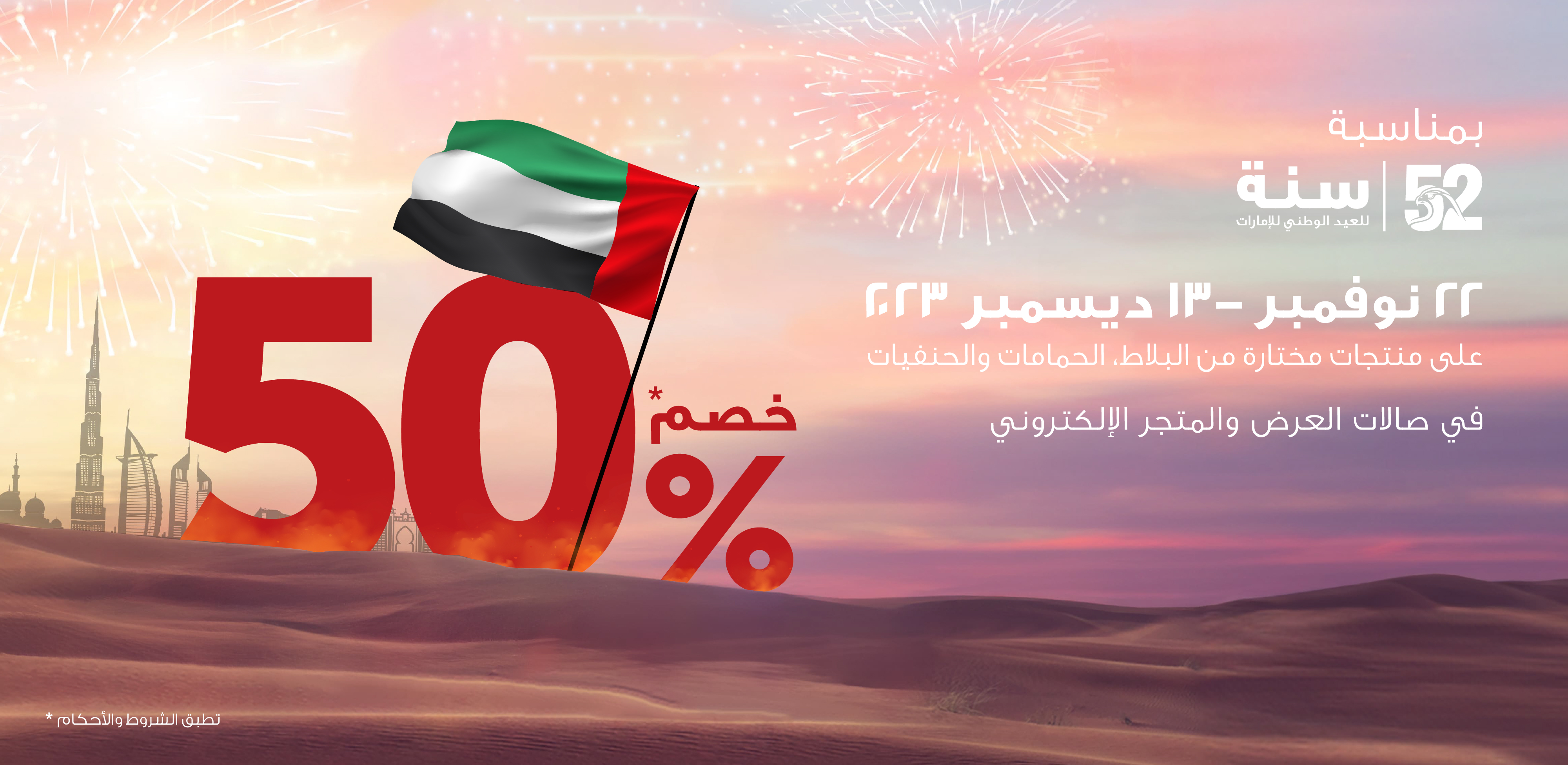 تحتفل شركة سيراميك رأس الخيمة باليوم الوطني مع خصم مذهل بنسبة 50% على البلاط والأدوات الصحية والحنفيات المختارة. استمتع بعروض بنصف السعر على منتجات مختارة عند التسوق في أي من صالات عرض سيراميك رأس الخيمة الرائدة في الإمارات العربية المتحدة أو التسوق عبر الإنترنت في الفترة من 22 نوفمبر إلى 13 ديسمبر