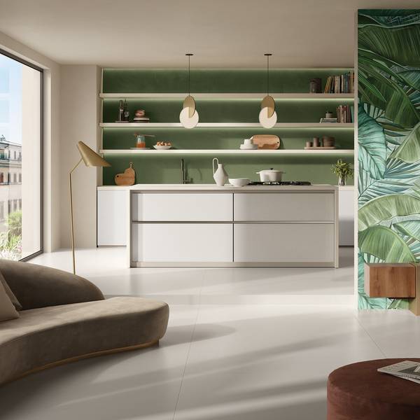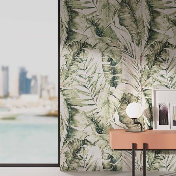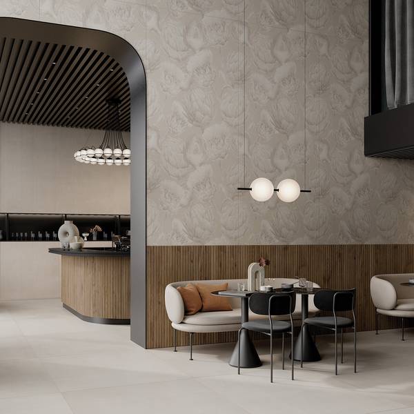 Metamorfosi, a collection that marks a turning point in the company’s creative approach and design capacity. Inspired by colors and shapes found in nature, Metamorfosi transfers these onto large-format brushed resin porcelain stoneware slabs to create striking wall decorations that become part of the interior design of residential or commercial developments. With vibrant shades of ivory and pink as basic colors, the collection uses these for decorative geometric and floral patterns, as well as some based on lush tropical leaves. These are combined with both stylized and extremely realistic elements that can truly characterize an environment, adding to the chosen taste and style of the furniture and architecture. The shapes on the ceramic surfaces look almost like they have been made by hand, with a putty knife or spatula, in a versatile, contemporary take on a wallpaper effect. Available in 4 colors and 3 decors, Metamorfosi a modern, sophisticated product range designed specifically to provide architects and interior designers with cladding solutions for all design requirements. Metamorfosi brings liveliness and naturalness to the collection, adding to an already extensive array of colors and decorative styles.